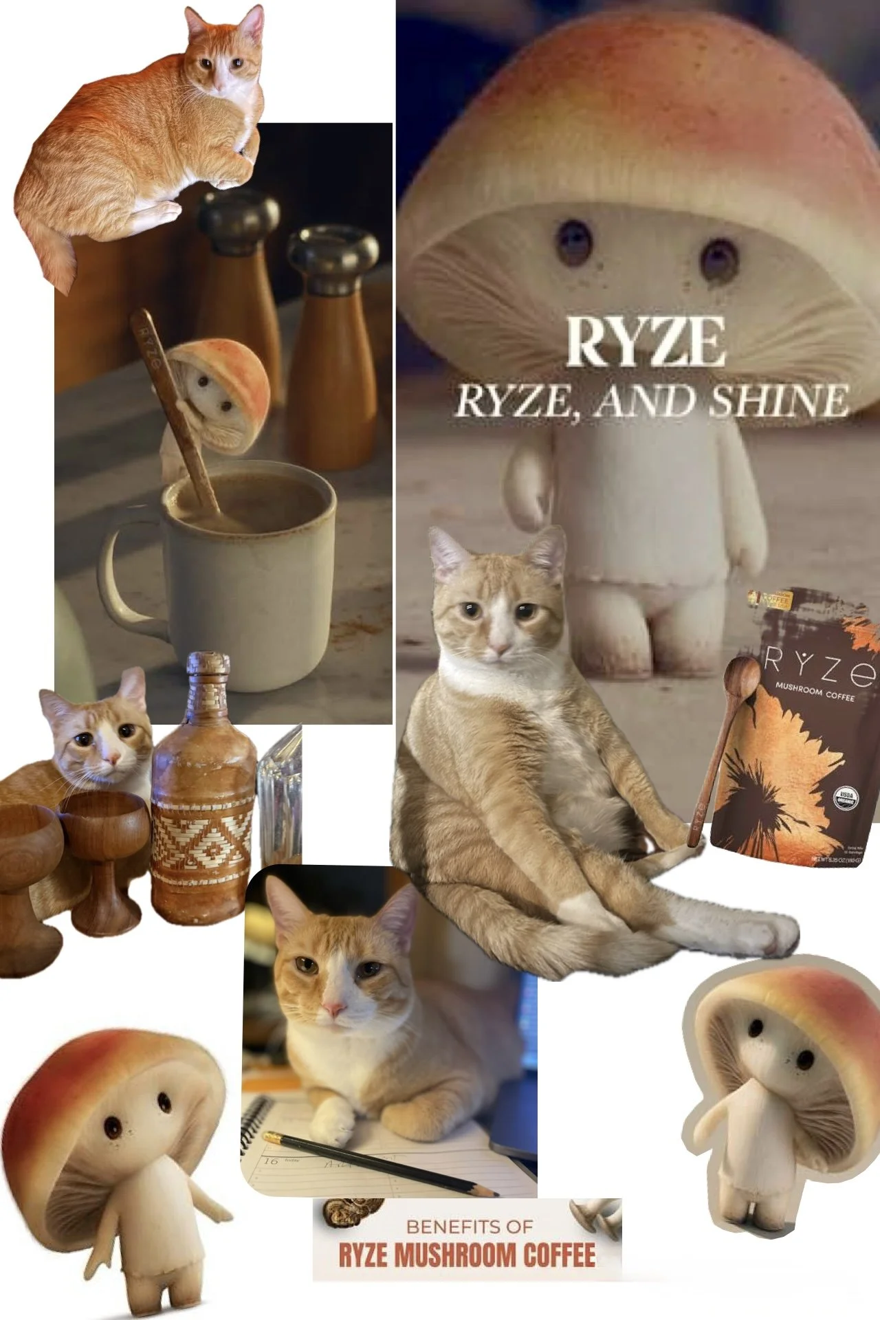 OH AND!… cosmic coincidence with the ginger cat day & mushroom month combo but my absolute fave commercial on network tv right now (which is an oxymoron for me b/c i tend to avoid commercials — except the ones on StartTV for a host of reasons) features an ADORABLE little mushroom character , the silent (spokesperson?) / animated ambassador for Ryze Mushroom Coffee who happens to resemble — in my opinion —my sweet adorable ginger boy kitty. Is it just me or do you see the resemblance too 😆? :